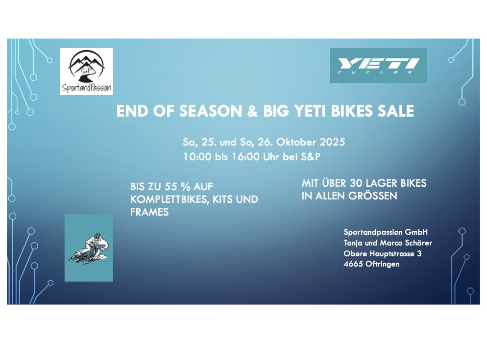 ShopCustom Bikes und PartsBekleidung und Accessoiresalles da zum Shop WerkstattServicepakete, Suspension Center,Laufradbau und Kurse zur Werkstatt PilatesPilates Training direkt bei uns im Studio zum Pilates Training EventsOpen / End of SeasonTagestouren und KurseReisen zu den Events Oktober News Comments Box SVG iconsUsed for the like, share, comment, and reaction icons SportandPassion GmbH 1 week ago EndofSeason big Yeti Sales bei SportandPassion in Oftringen… mit über 30 Bikes und bis zu 55% Rabatt. @tst_trading_ch @yeticycles ... Mehr sehenWeniger sehen View on Facebook · Share Auf Facebook teilen Auf Twitter teilen Auf LinkedIn teilen Per E-Mail teilen View Comments likes 0 Shares: 2 Comments: 0 Load more unsere letzten Newsletter zum nachlesen: